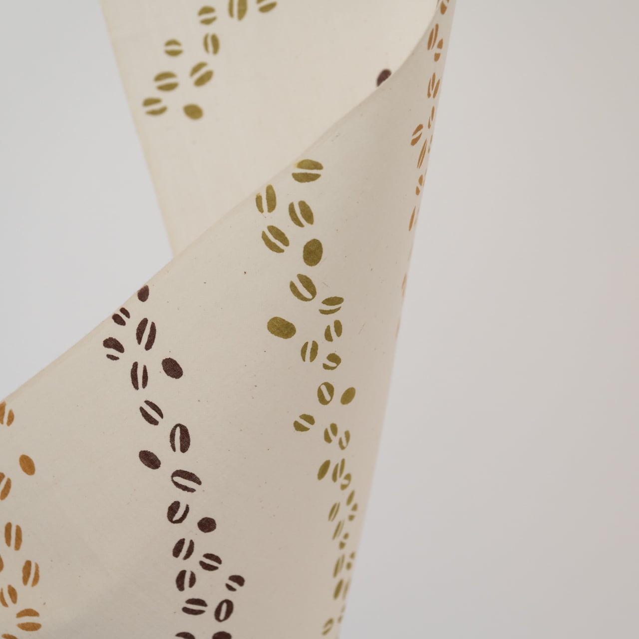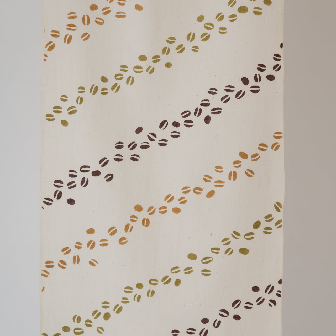 綿花の種の粒が残る素朴な生地のなかに、生豆、浅煎り、深煎りの豆が縞模様に並んでいます。