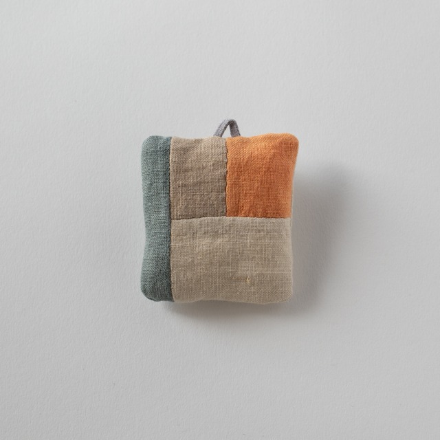天日干しのリネンを縫い合わせたミニ座布団。 アクセサリーを置いたり、ピンクッションとして使ったり。 天然染料と化学染料の両方を使って染めています。 中綿は木綿わたです。 寸法:縦 6 ×横 5.5 × 厚さ 1 cm