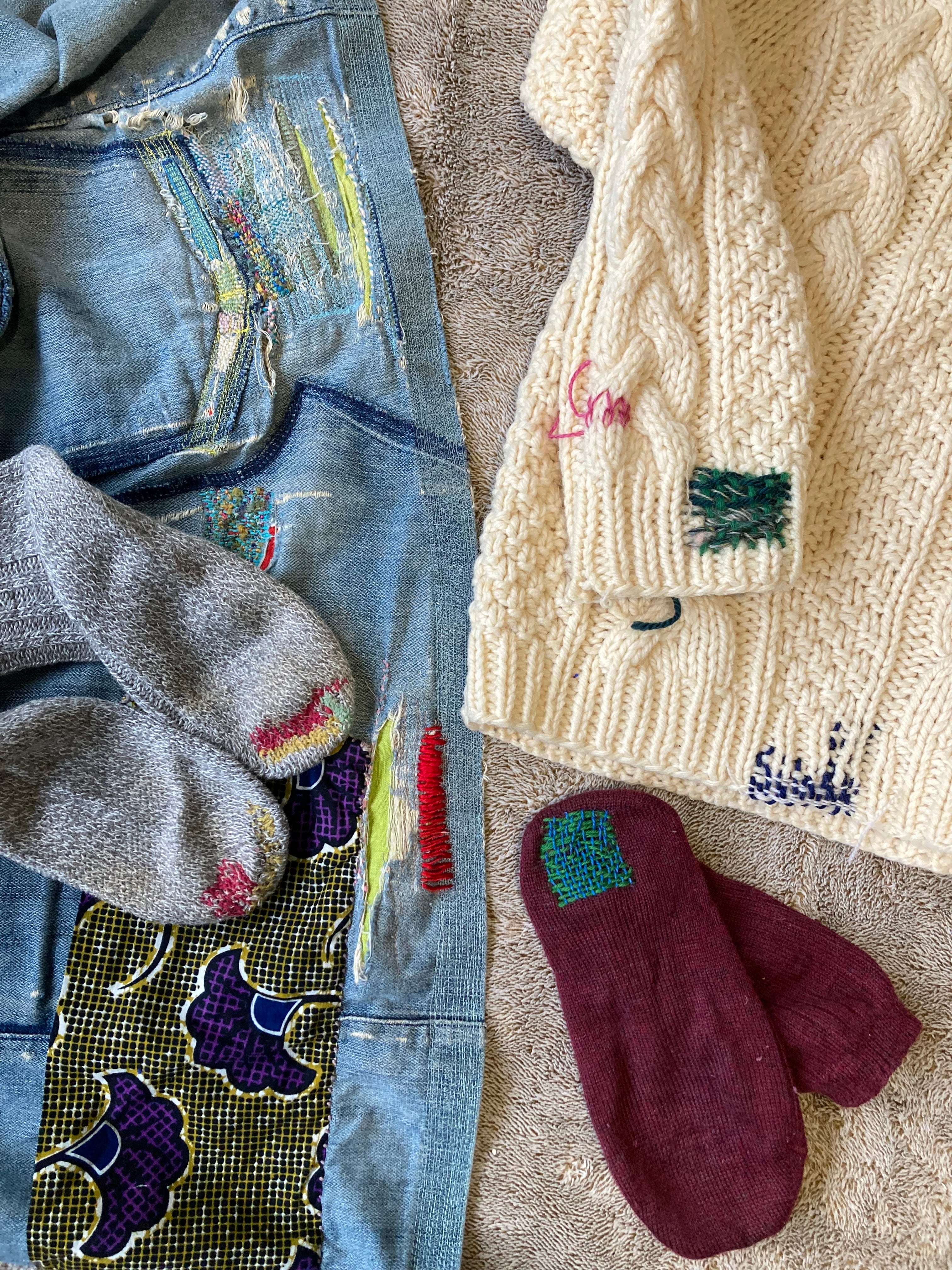 前半のレクチャーでは、シンプルかつ「これさえできれば!」な繕い技法4つをご紹介。 後半ではそれを踏まえて、お持ちになったものを実際に繕っていきます。